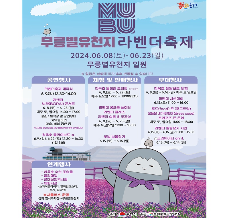 올해로 2회째를 맞이하는 라벤더 축제는 6월 8일부터 23일까지 무릉별유천지에서 열립니다. 축제 기간 동안 라벤더를 활용한 다양한 체험 활동을 즐길 수 있습니다. 라벤더 클래스를 통해 향주머니와 부케, 화분을 직접 만들어보는 것도 좋은 추억이 될 것입니다. 또한 청옥호 둘레길 트래킹과 페달 카약 체험, 플라이보드쇼 등 다양한 행사도 준비되어 있습니다.